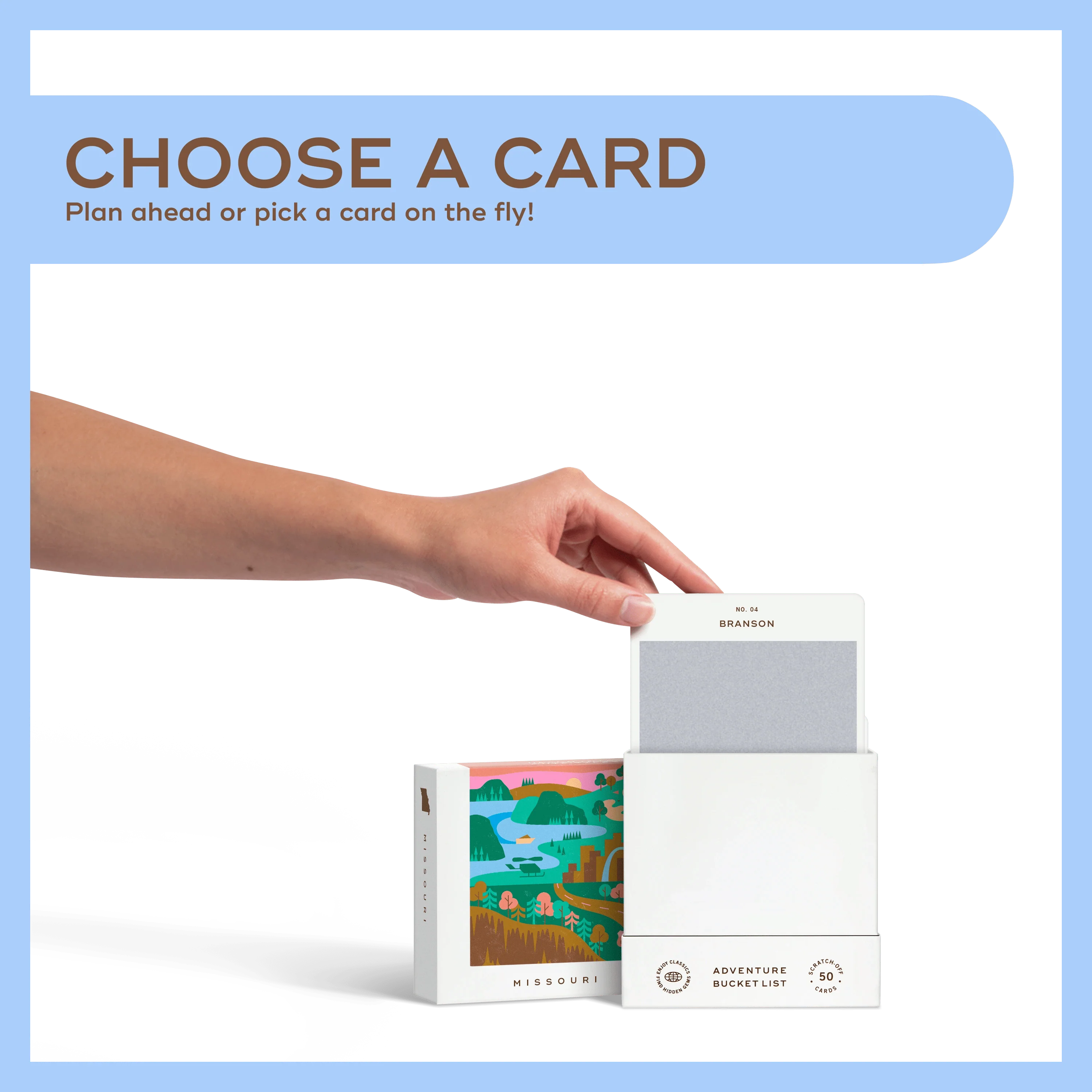 50 scratch off bucket list adventures around the state of Missouri. Pick a city that you want to explore, check out the icons at the bottom of the card to determine the season, cost, and time of day, and then scratch off the card to reveal your adventure!